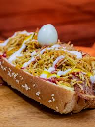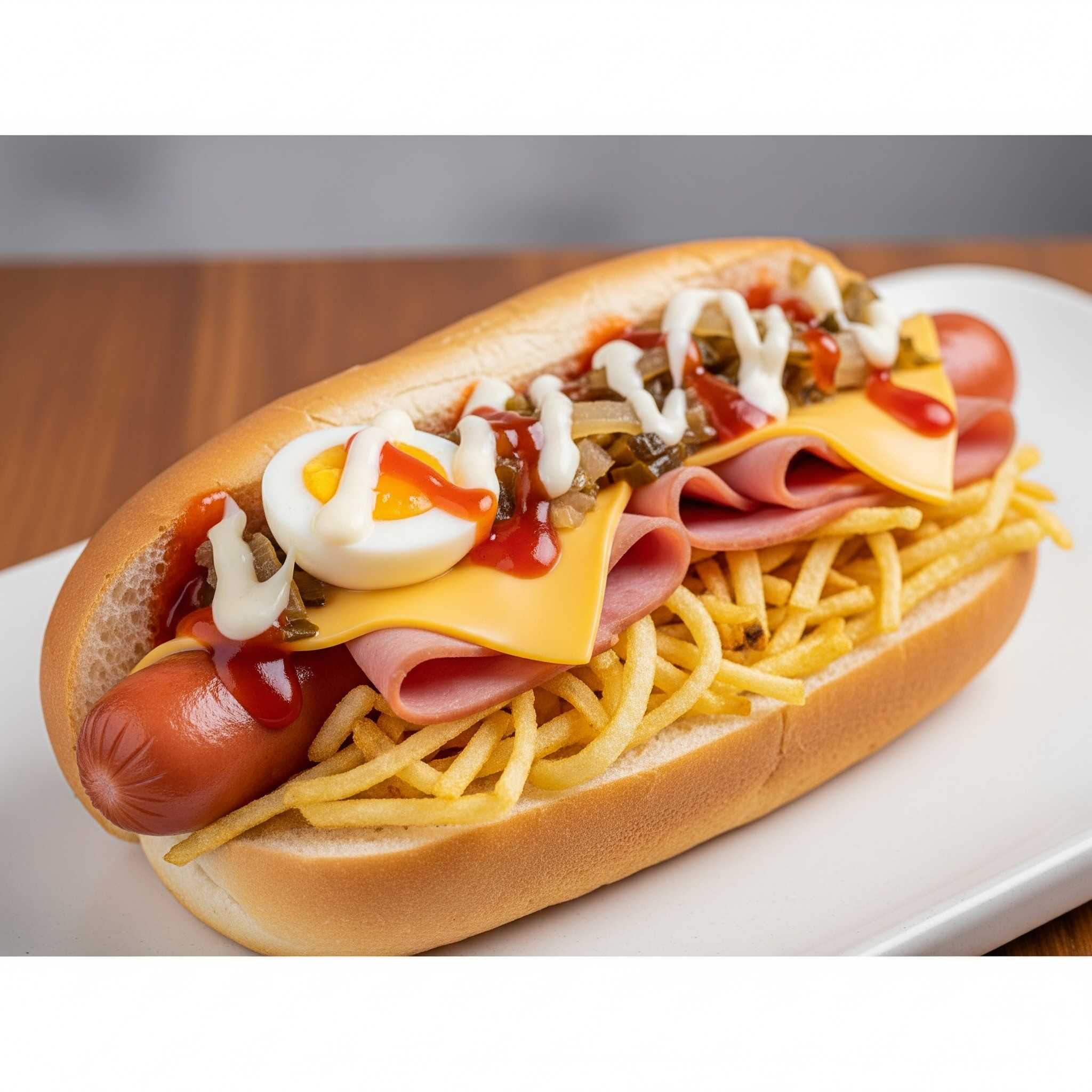 Salchicha long, jamón, queso, cebolla, huevo de codorniz, papas chips y salsas (tomate, mayonesa, mostaza).