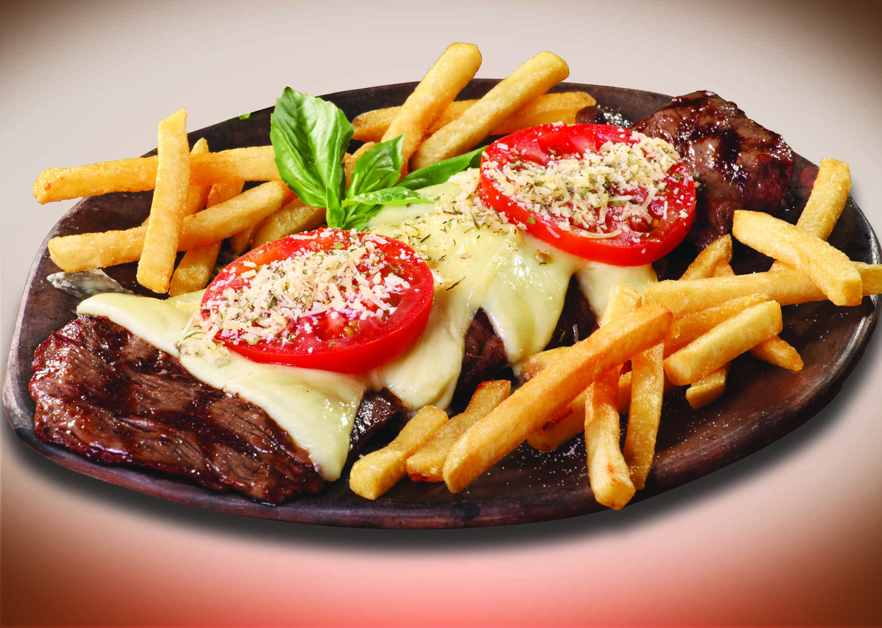 Papas a la francesa, salchicha long y americana, chorizo, tocineta, maíz, jamón, pollo y carne desmechada, maduro, 25 g de costilla BBQ, vegetales, queso, papa chips, huevo de codorniz y salsas (tomate, mayonesa, mostaza).