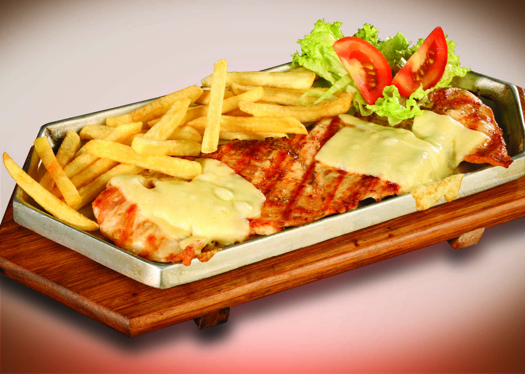 Pechuga gratinada acompañada de arroz, papa a la francesa, patacón y ensalada.