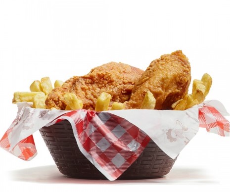 2 Piernas de pollo al broaster acompañadas de papa a la francesa y salsas.