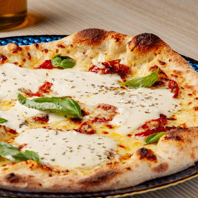 Pizza 6 porciones de 35cm, Base blanca, mozzarella, cherry, búfala fresca, albahaca, reducción de balsámico