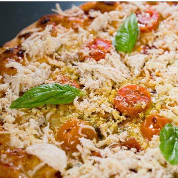 Pizza 4 porciones de 27 cm, Salsa roja san marzano, pesto, mozzarella, pollo cherry, tocineta, parmesano