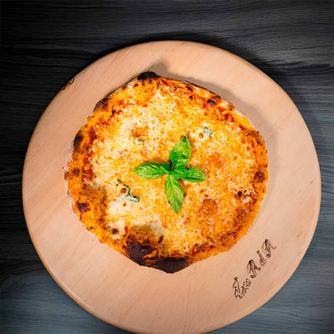 Pizza 4 porciones de 27 cm, en salsa roja san marzano, mozzarella, búfala, albahaca.
