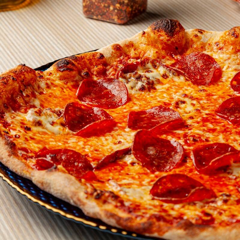 Pizza 4 porciones de 27 cm, salsa roja san marzano, mozzarella, pepperoni.