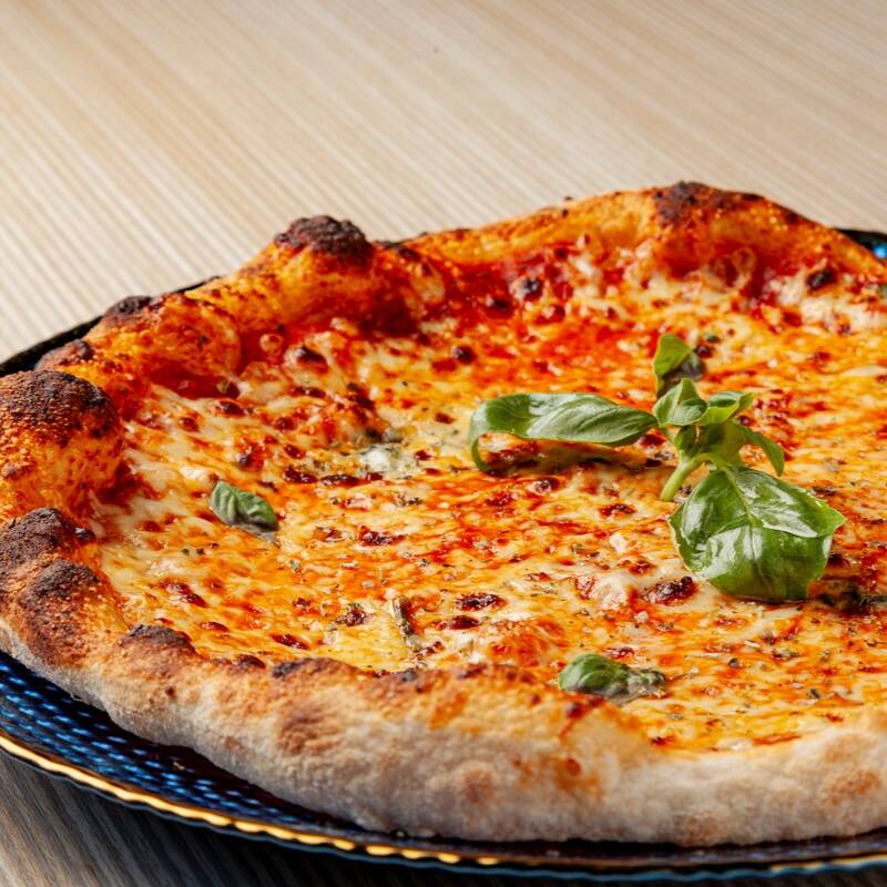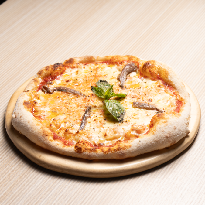 Pizza 4 porciones de 27cm, en salsa roja san marzano, mozzarella,albahaca, anchoas italianas, búfala, oregano