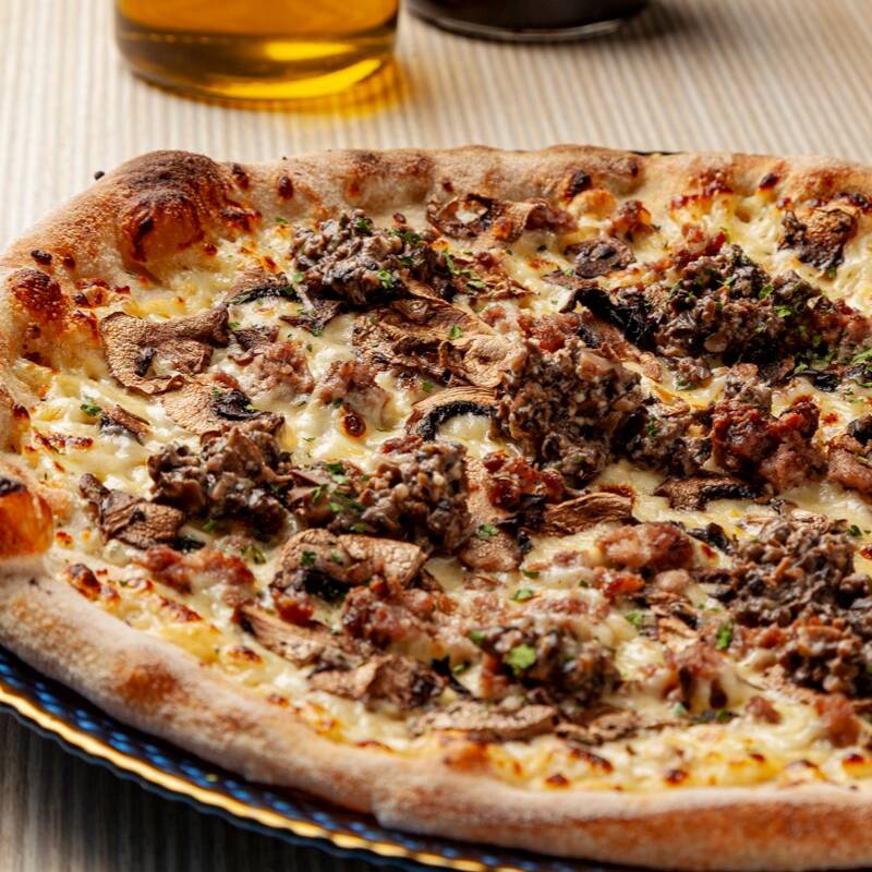 Pizza 6 porciones de 35cm, en base blanca, champiñones, chorizo italiano, guanciale, crema de trufa y mozzarella