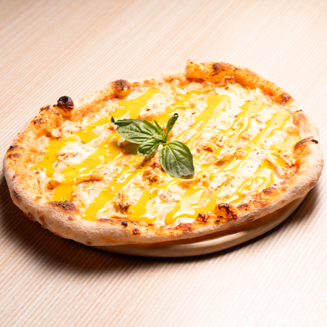 Pizza 4 porciones de 27 cm, en salsa roja san marzano, mozzarella, pollo, miel mostaza