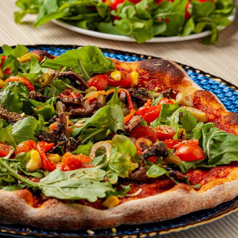 Pizza 4 porciones de 27 cm, en salsa roja san marzano, mozarella, zucchini, cherry, champiñones, aceitunas.
