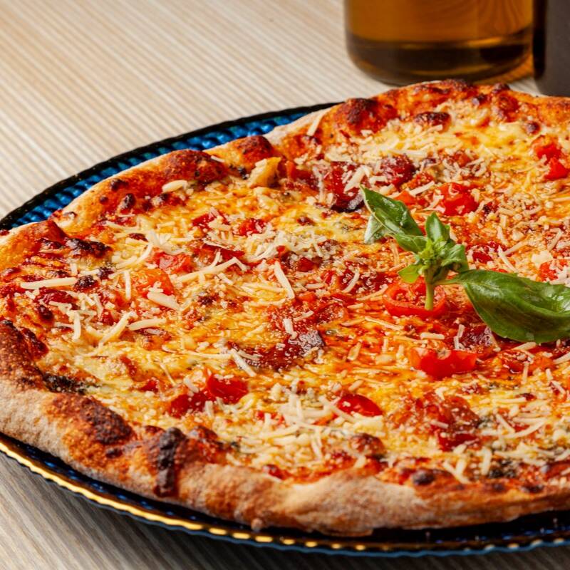 Pizza 4 porciones de 27 cm, en salsa roja san marzano, mozzarella, queso azul, parmesano, pimienta