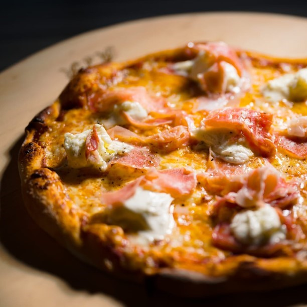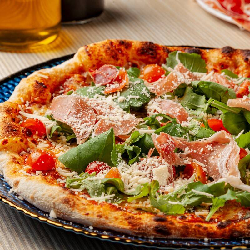 Pizza 4 porciones de 27 cm, en salsa roja san marzano, mozzarella, prosciutto, búfala fresca y reducción de balsamico