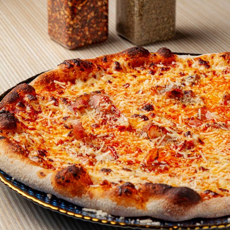 Pizza 4 porciones de 27cm, en salsa roja san marzano, mozzarella, guanciale, tomate rostizado, parmesano.