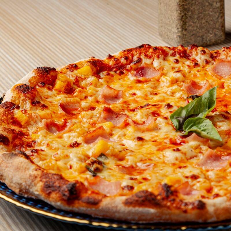 Pizza 4 porciones de 27 cm, en salsa roja san marzano, mozzarella, piña, jamon ahumado, albahaca