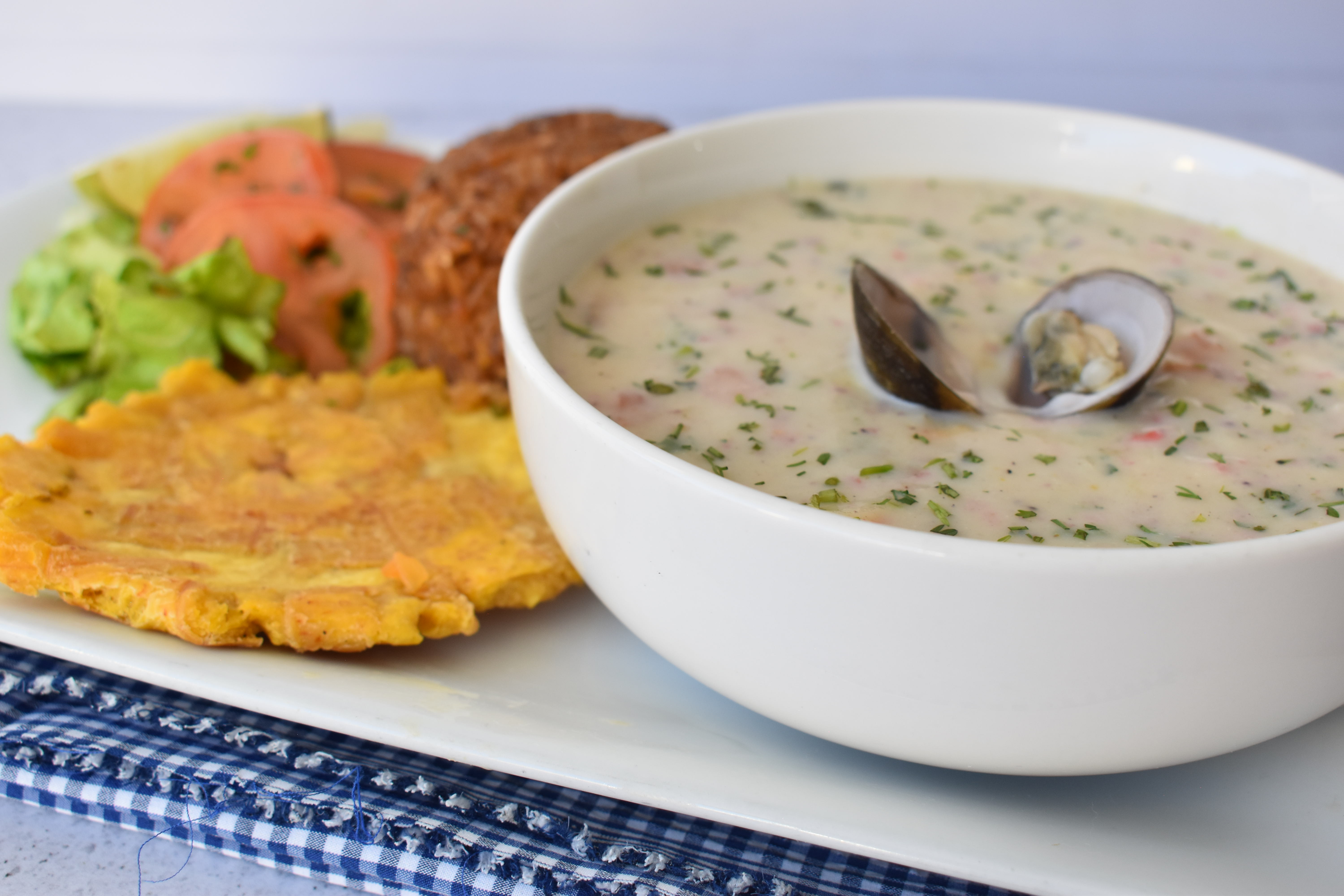 Cazuela, acompañada de mariscos, camarones, palmitos, almejas, caracol, conchas, anillos y queso en una deliciosa crema de leche, acompañado de patacón, ensalada, limonada.
