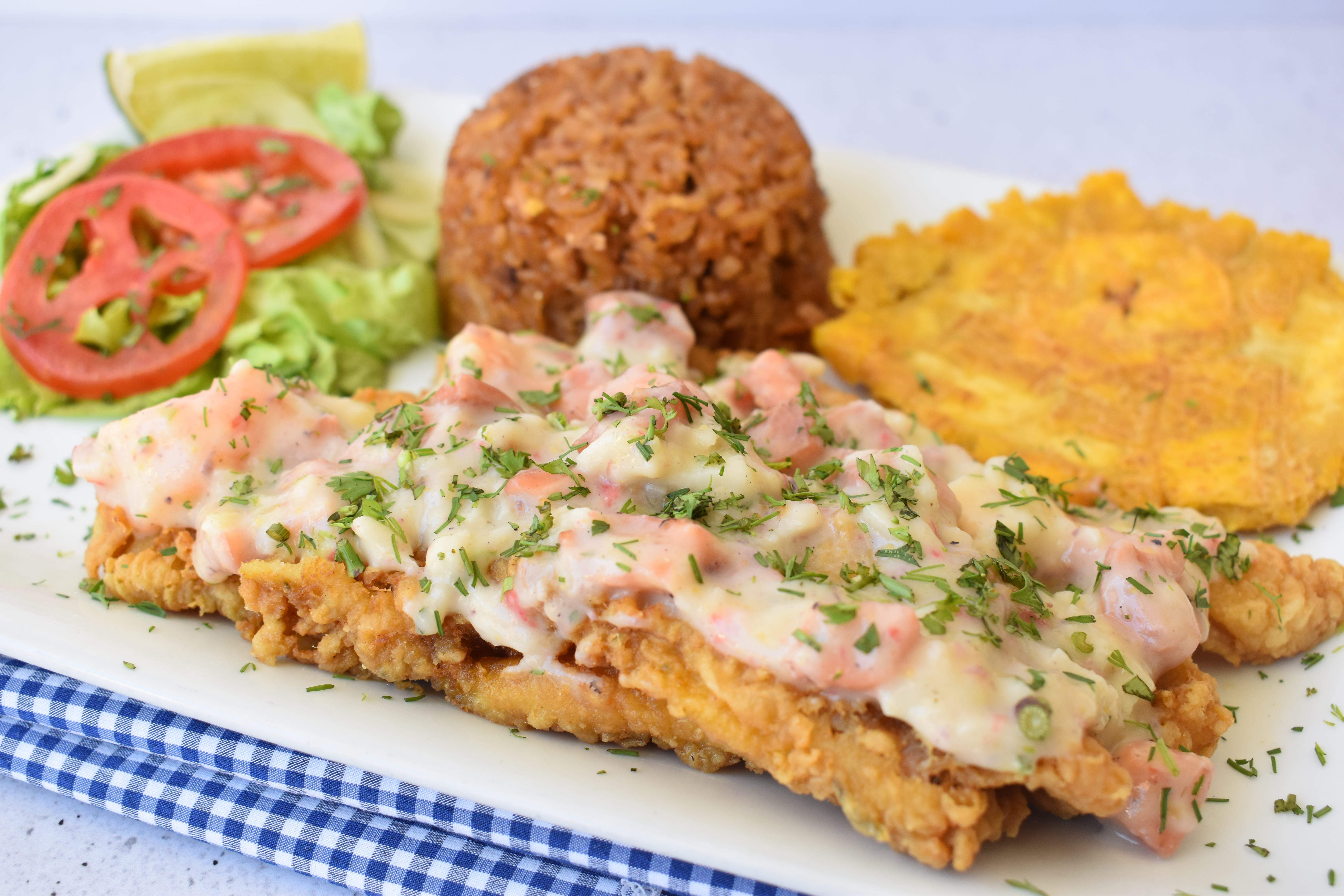 Delicioso filete de pescado apanado, acompañado de patacón, ensalada, arroz de coco o blanco, sancocho de pescado, limonada.