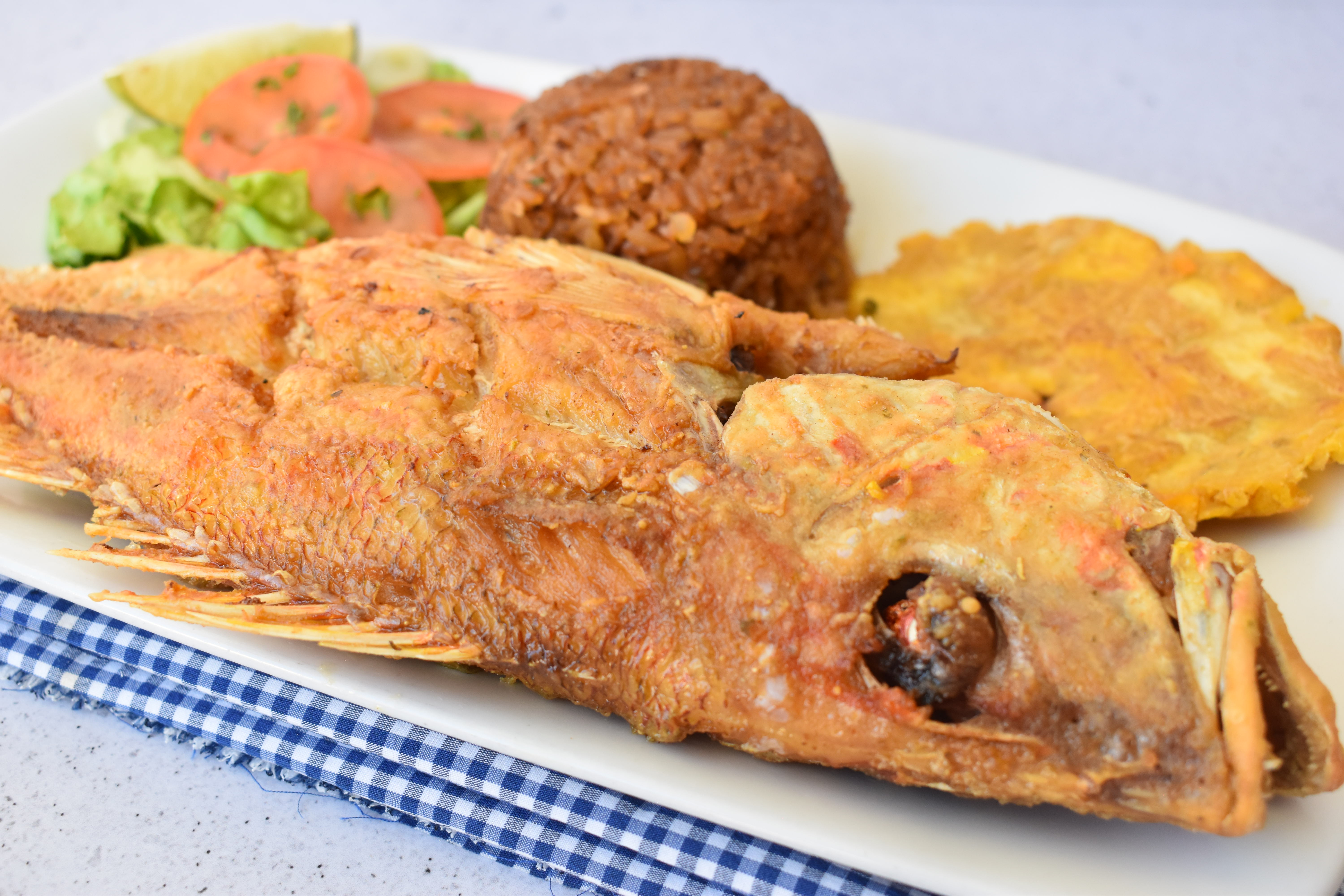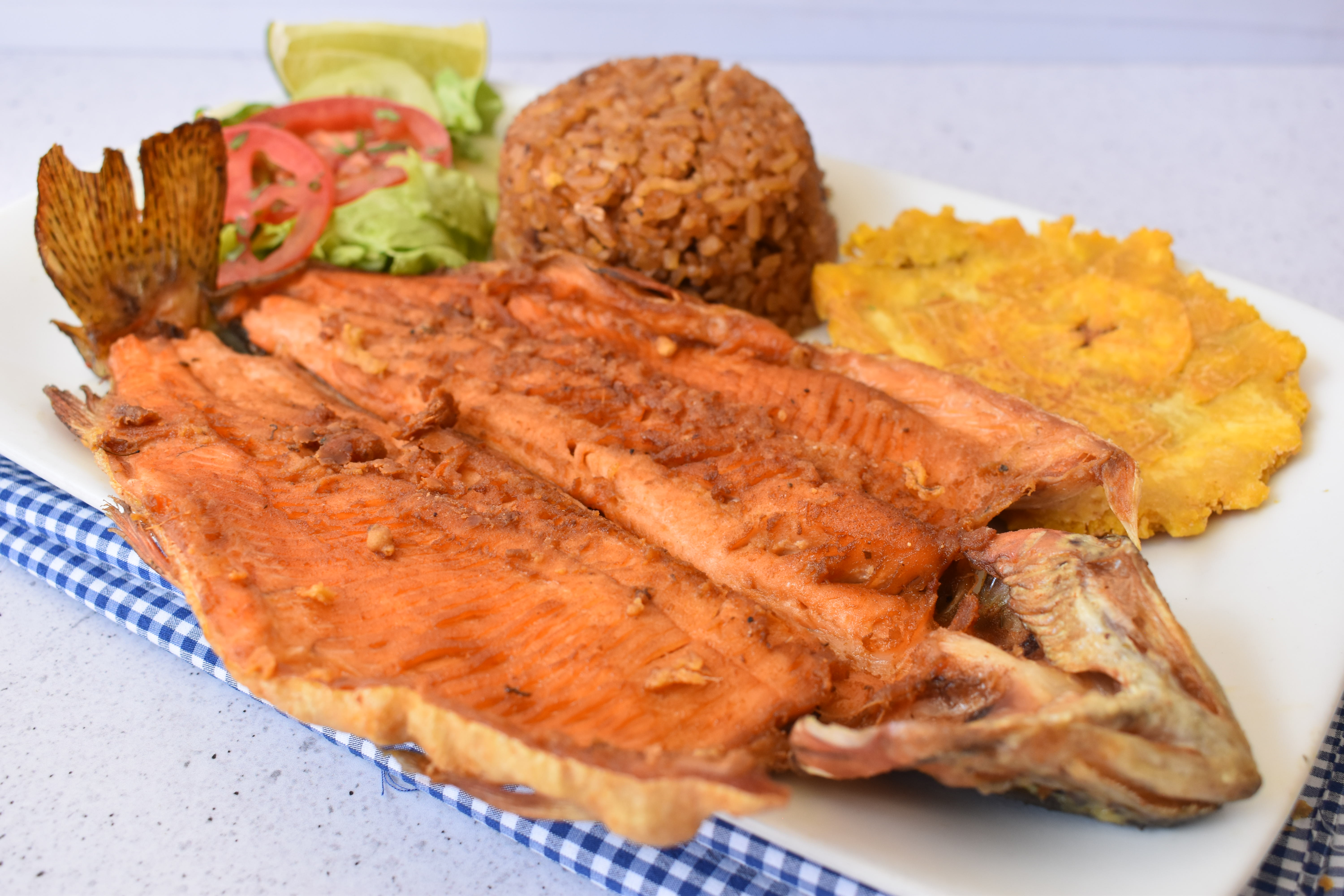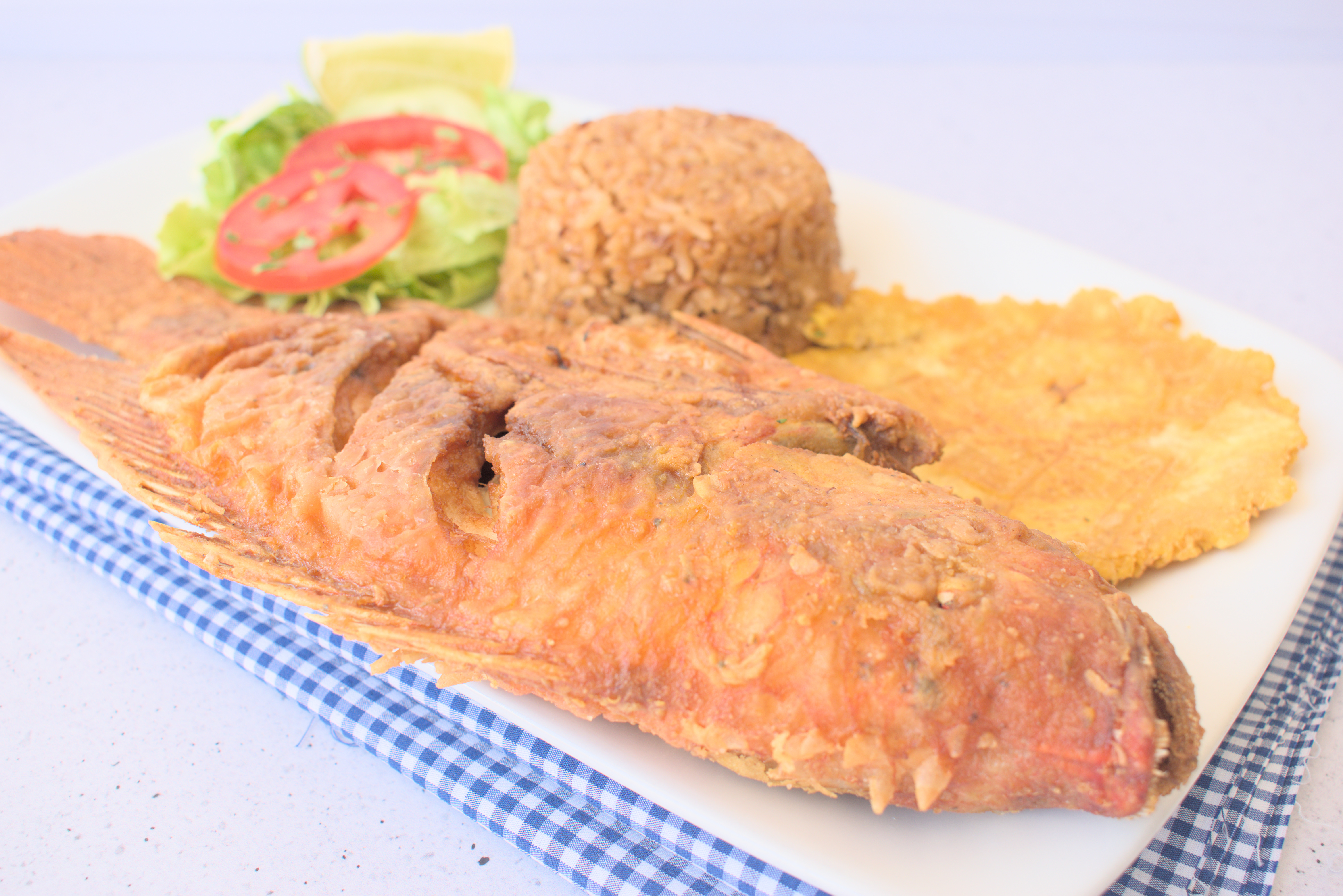 Deliciosa mojarra frita, acompañada de patacón, ensalada, arroz de coco o blanco, sancocho de pescado, limonada.