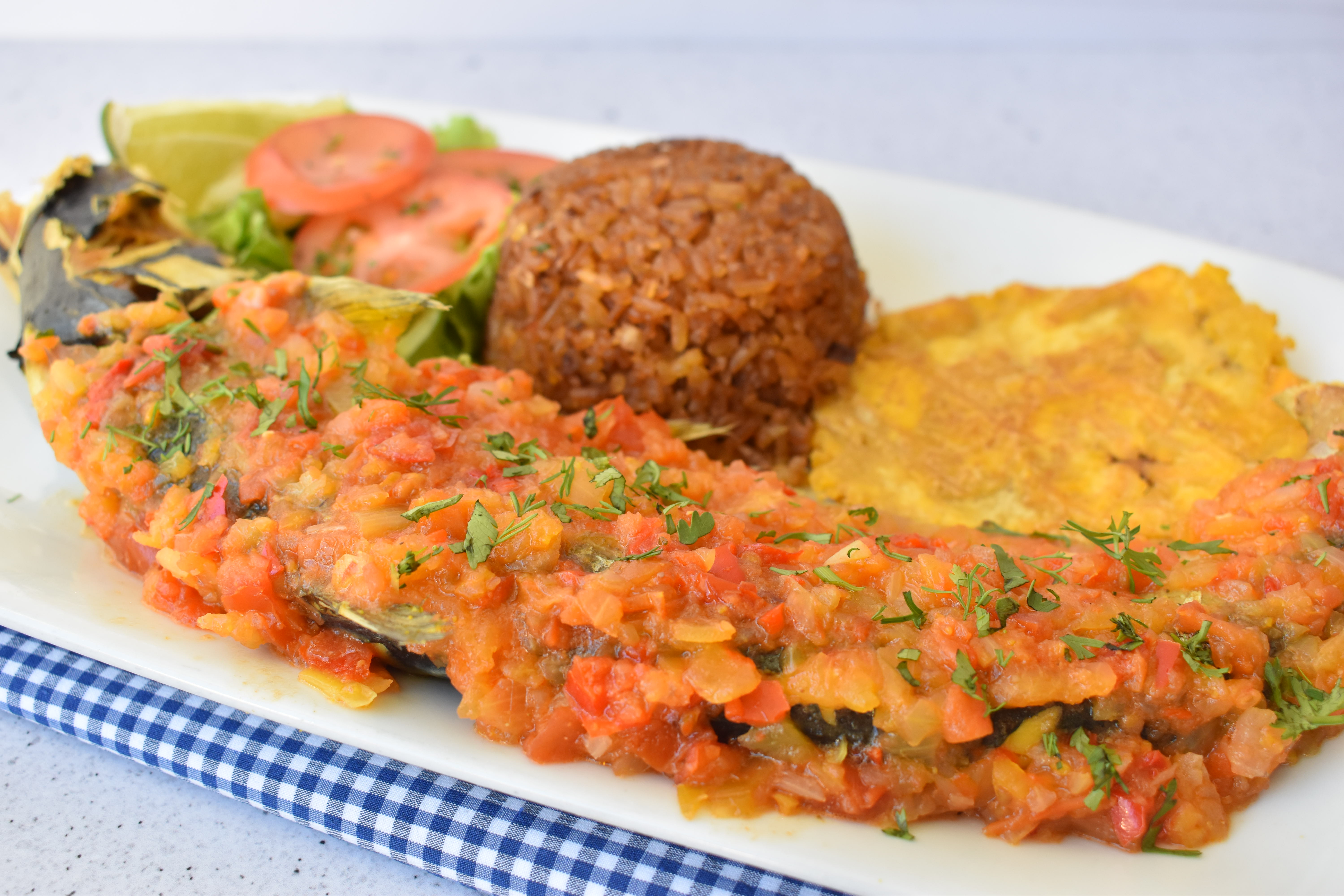 Deliciosa mojarra en salsa, acompañada de patacón, ensalada, arroz de coco o blanco, sancocho de pescado, limonada.