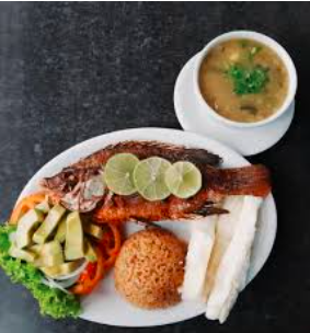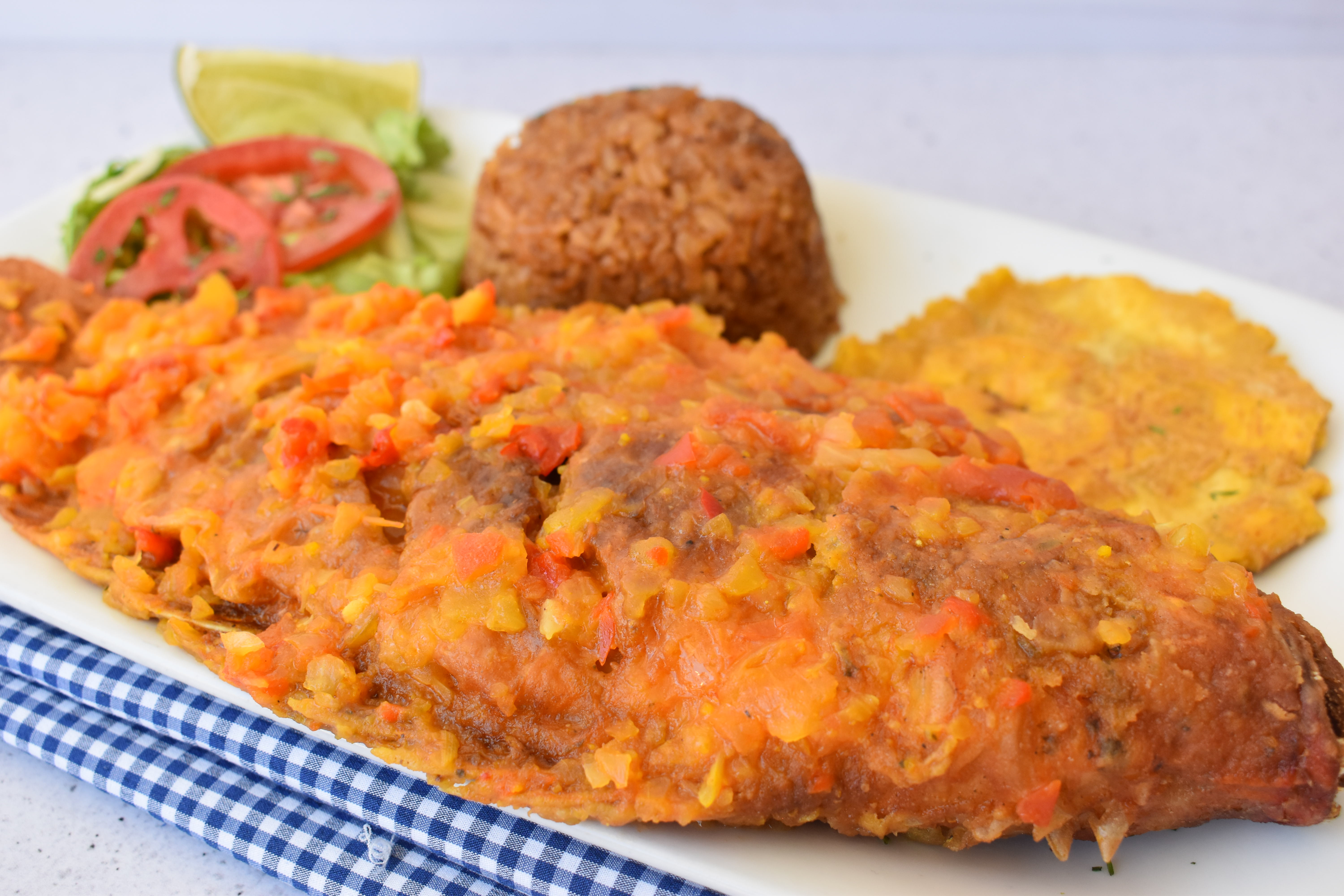 Delicioso pescado apanado, acompañado de patacón, ensalada, arroz de coco o blanco, sancocho de pescado, limonada.