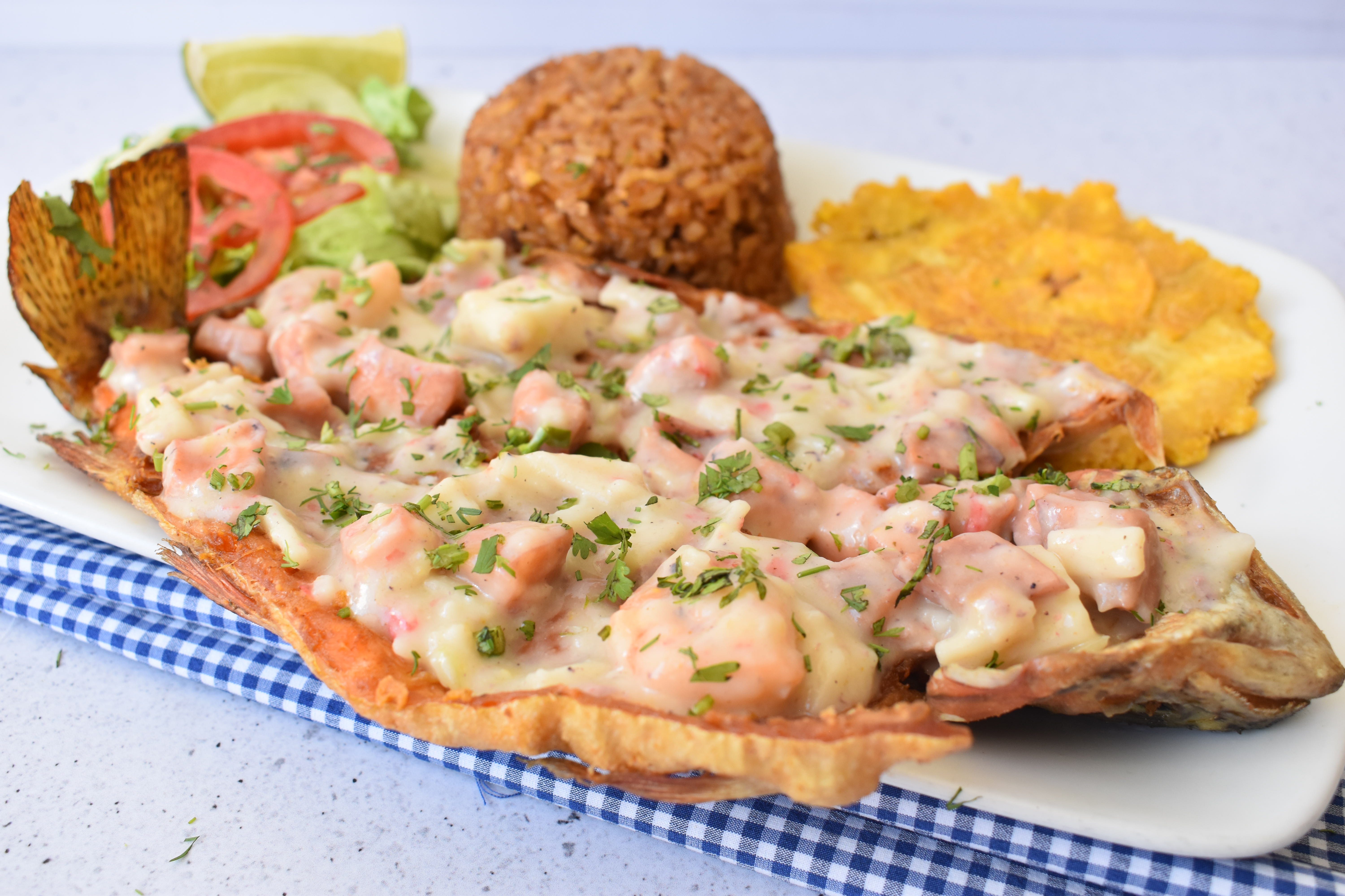 Deliciosa trucha en salsa de mariscos, camarones, palmitos y almejas, acompañada de patacón, ensalada, arroz de coco o blanco, sancocho de pescado, limonada.
