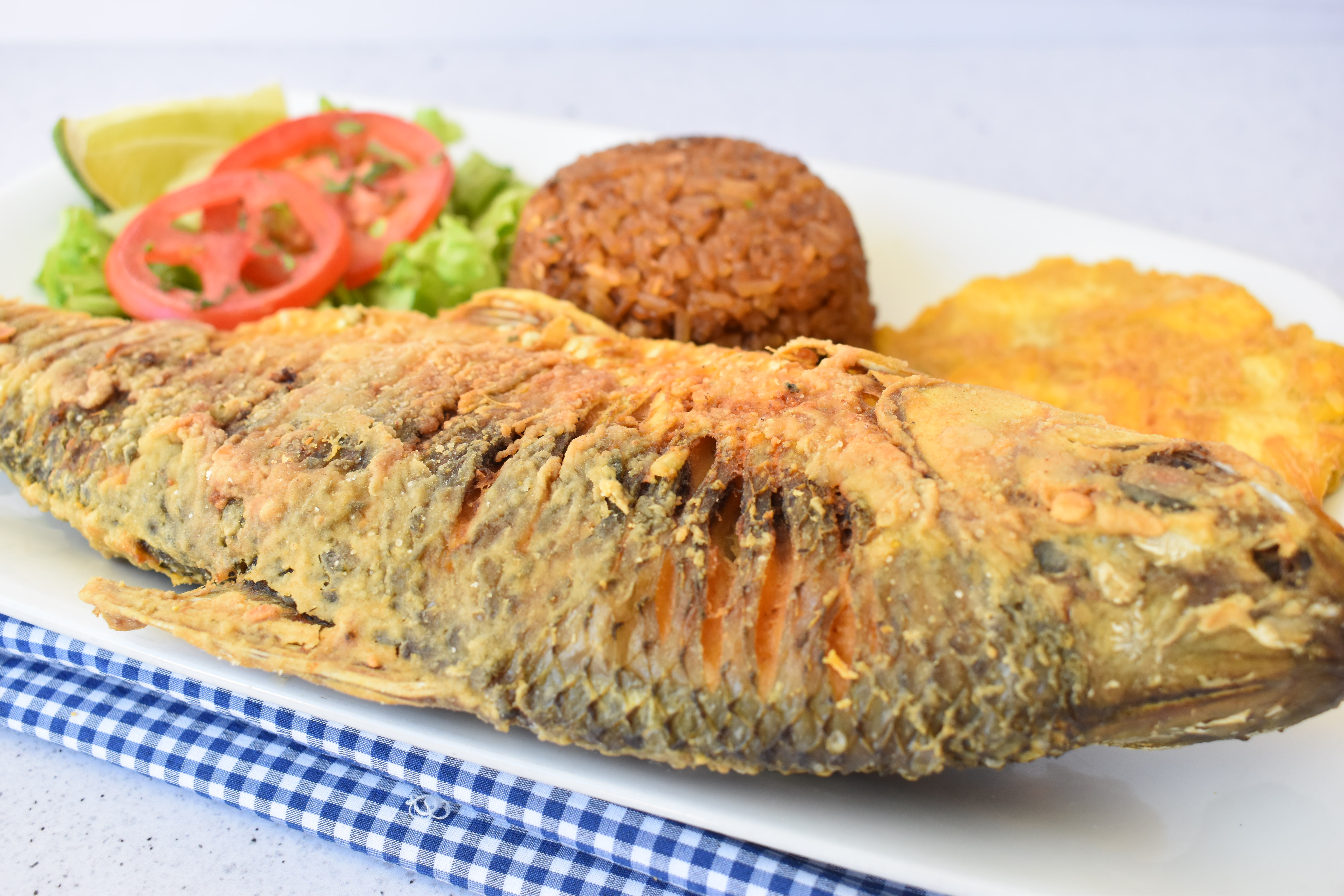 Cachama frita y crujiente, acompañado de patacón, ensalada, arroz de coco o blanco, sancocho de pescado, limonada.