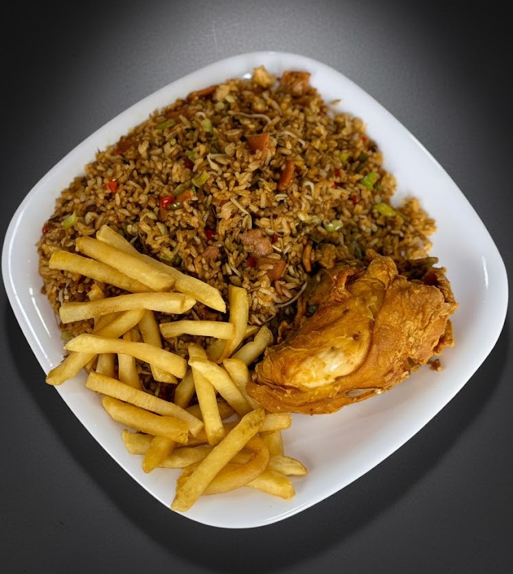 Arroz chino personal, acompañado de porción de papa a la francesa y presa de pollo broaster