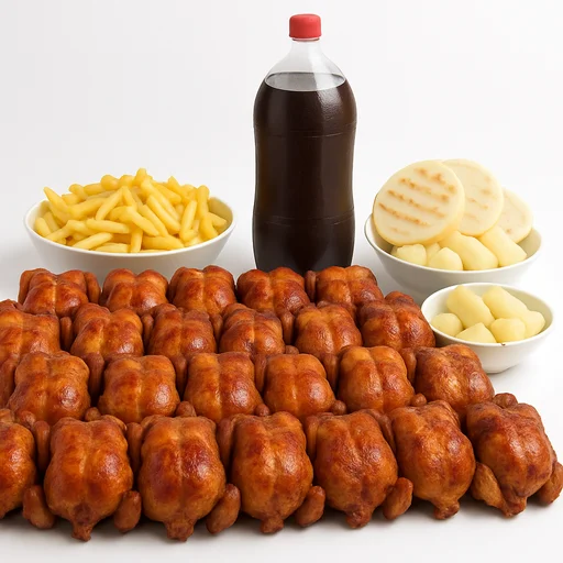 2 Pollos asados con papa, 8 arepas, yuca y gaseosa econolitro.