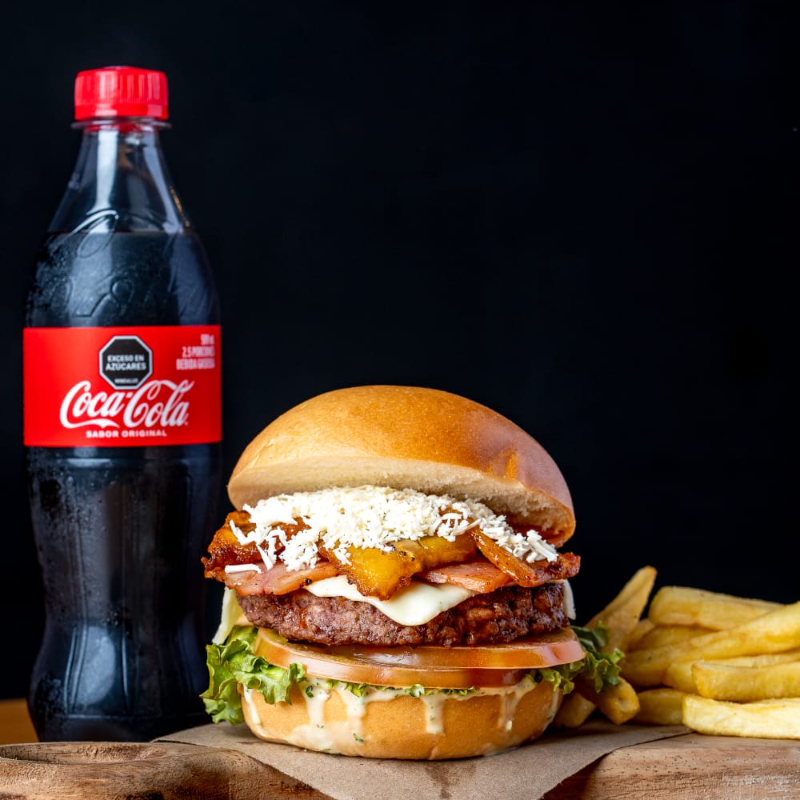hamburguesa de res de 100gr con queso cheddar pepinillos lechuga tomate pan de la casa salsa de ajo + papas + gaseosa