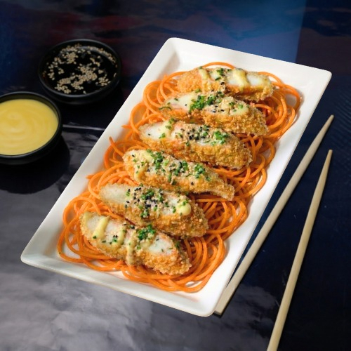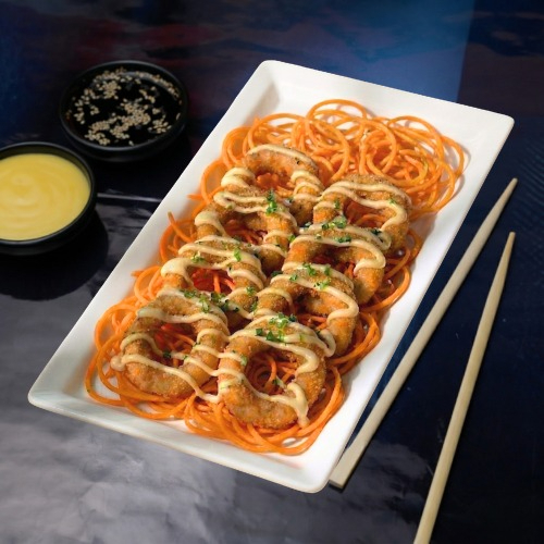 8 camarones crunch, salsa fantasy, cebollín y una cama de zanahoria en espiral.