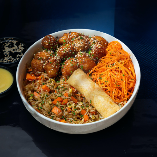 Arroz estilo chino salteado al wok con zanahoria, raíces chinas y salsa soya, camarones crunch bañados en salsa agridulce, zanahoria en espiral, un egg roll, ajonjolí mixto y cebollín + una (1) Salsa a elección.