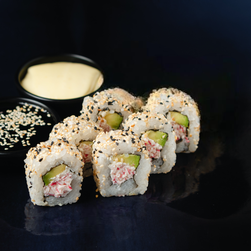12 Bocados frescos o tempura philadelhia, (salmón fresco, queso crema, aguate y cubierto de ajonjolí).