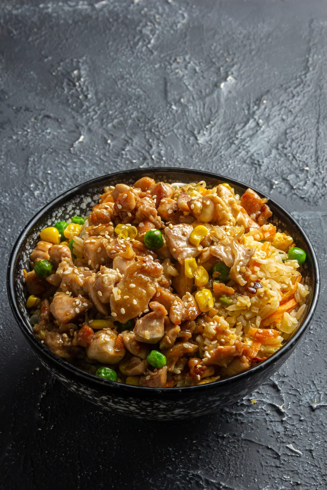 Pollo teriyaki, acompañado de arroz yakimeshi.