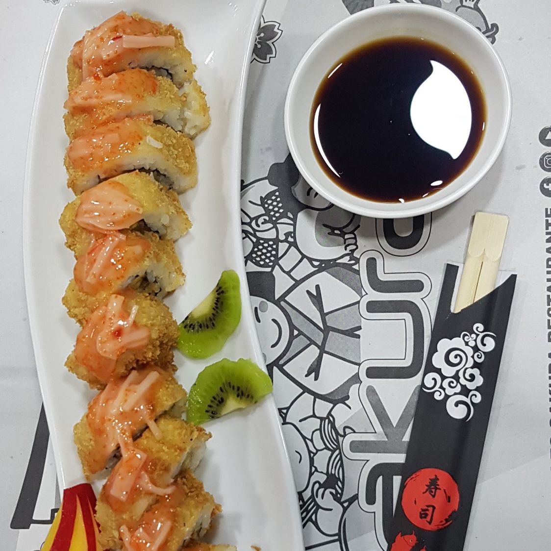 Langostino crispy, plátano maduro, mayonesa japonesa, envuelto en salmón.