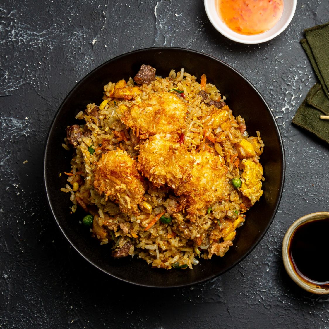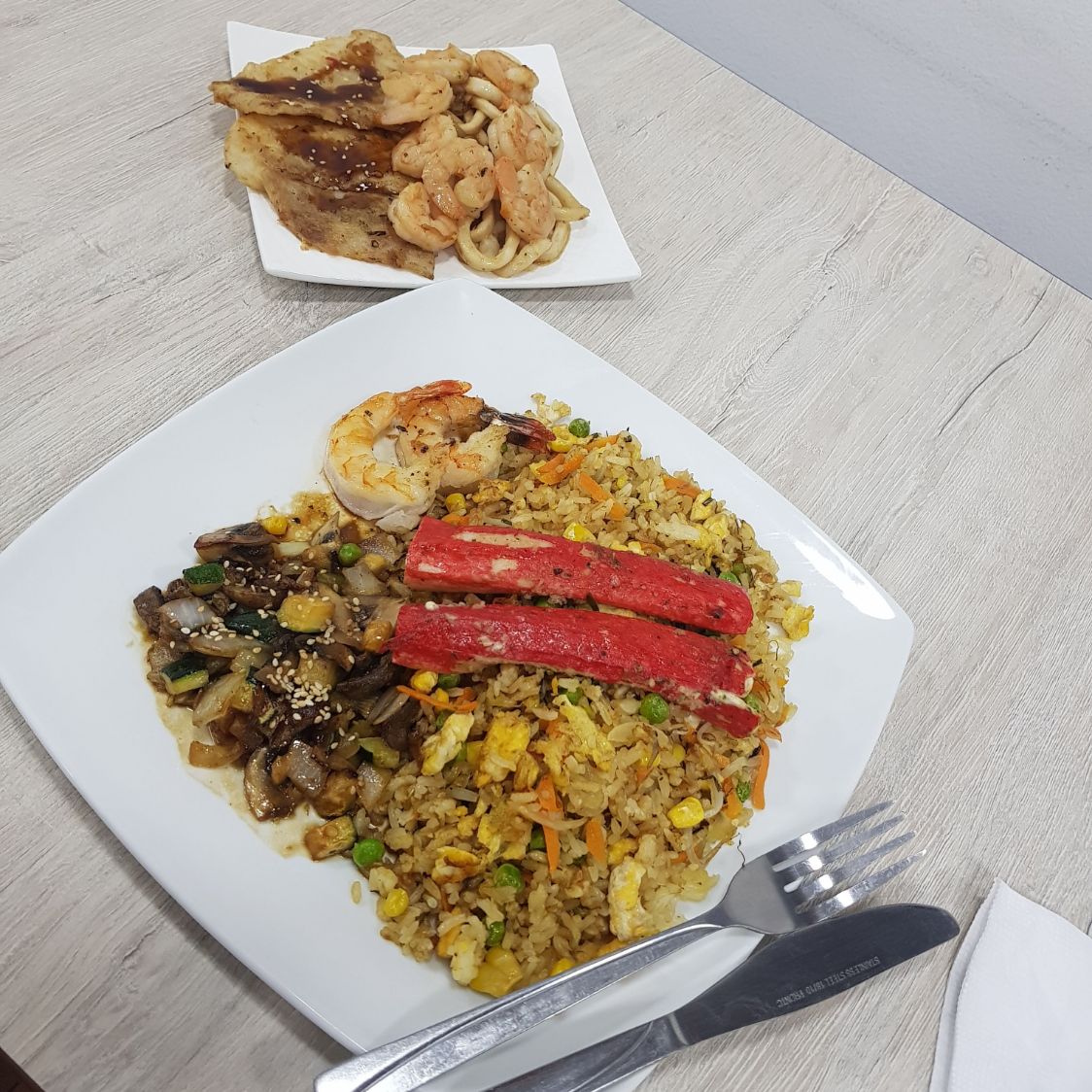 Camarón, anillos de calamar y palmitos de cangrejo, acompañados de arroz yakimeshi.