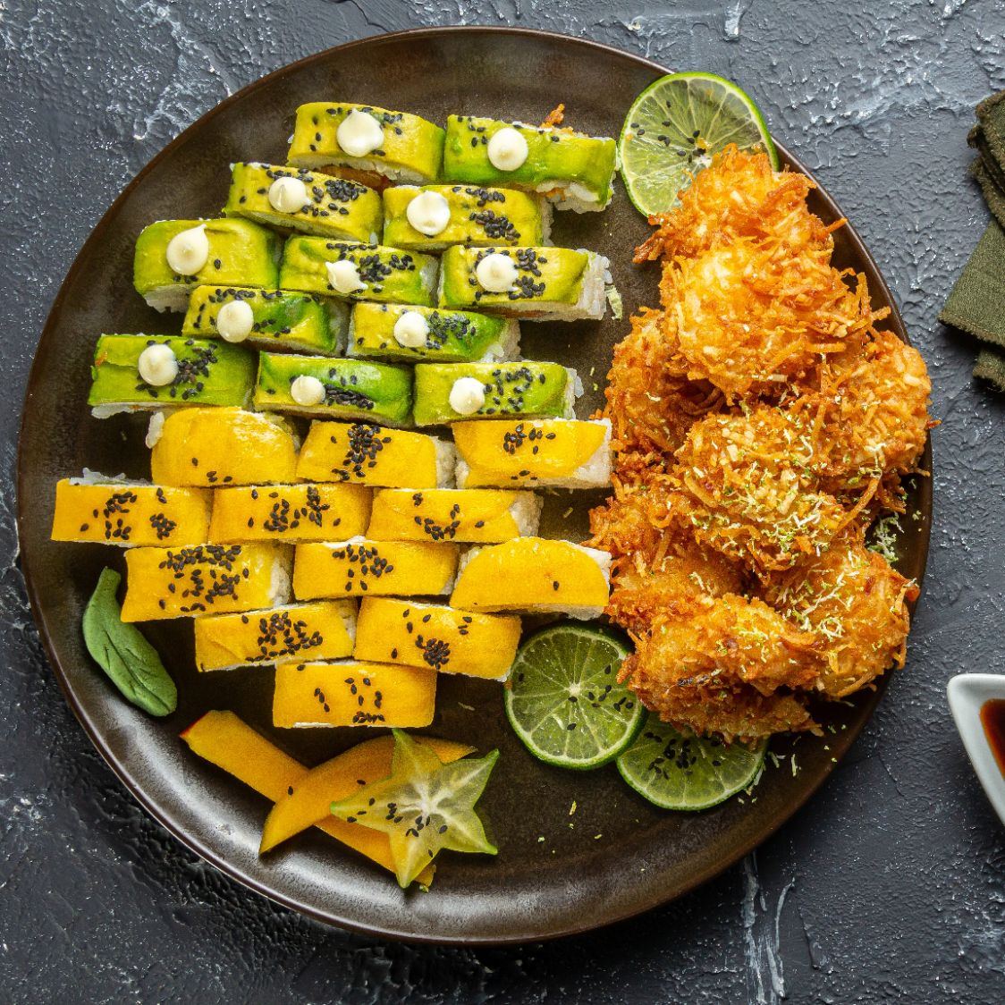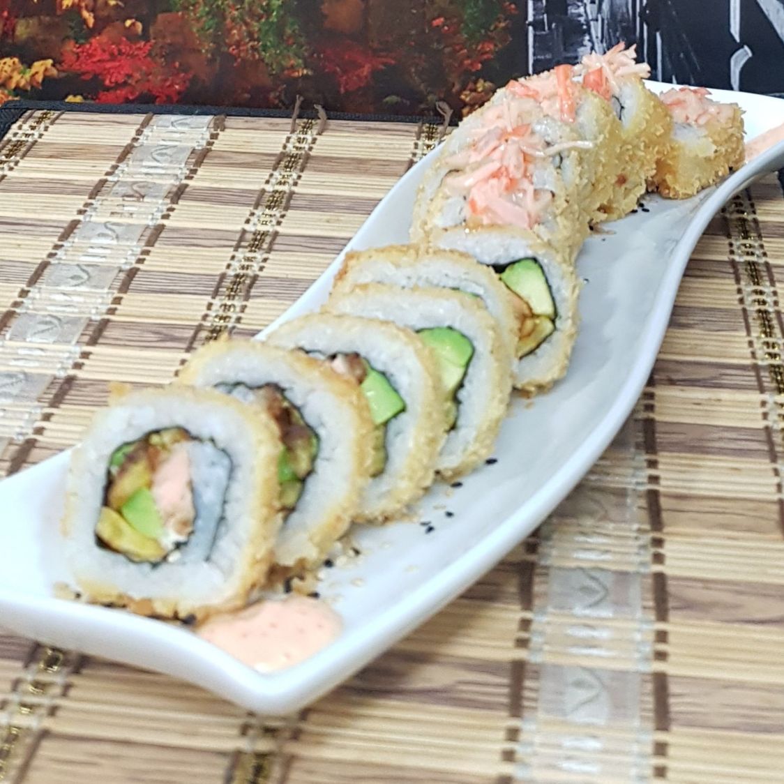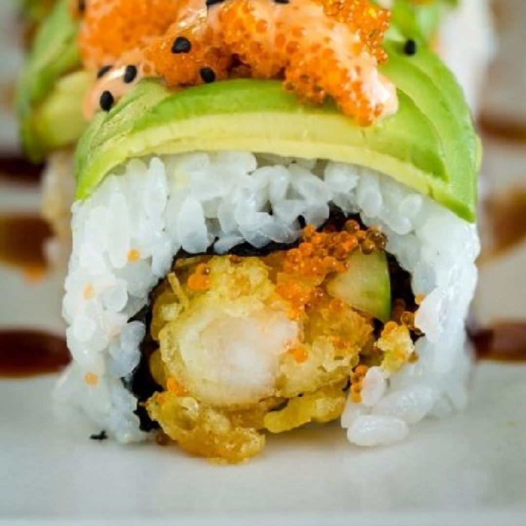 Langostino crispy, plátano maduro, aguacate y queso crema, crocante por fuera y topping de salsa dinamita y kanikama.