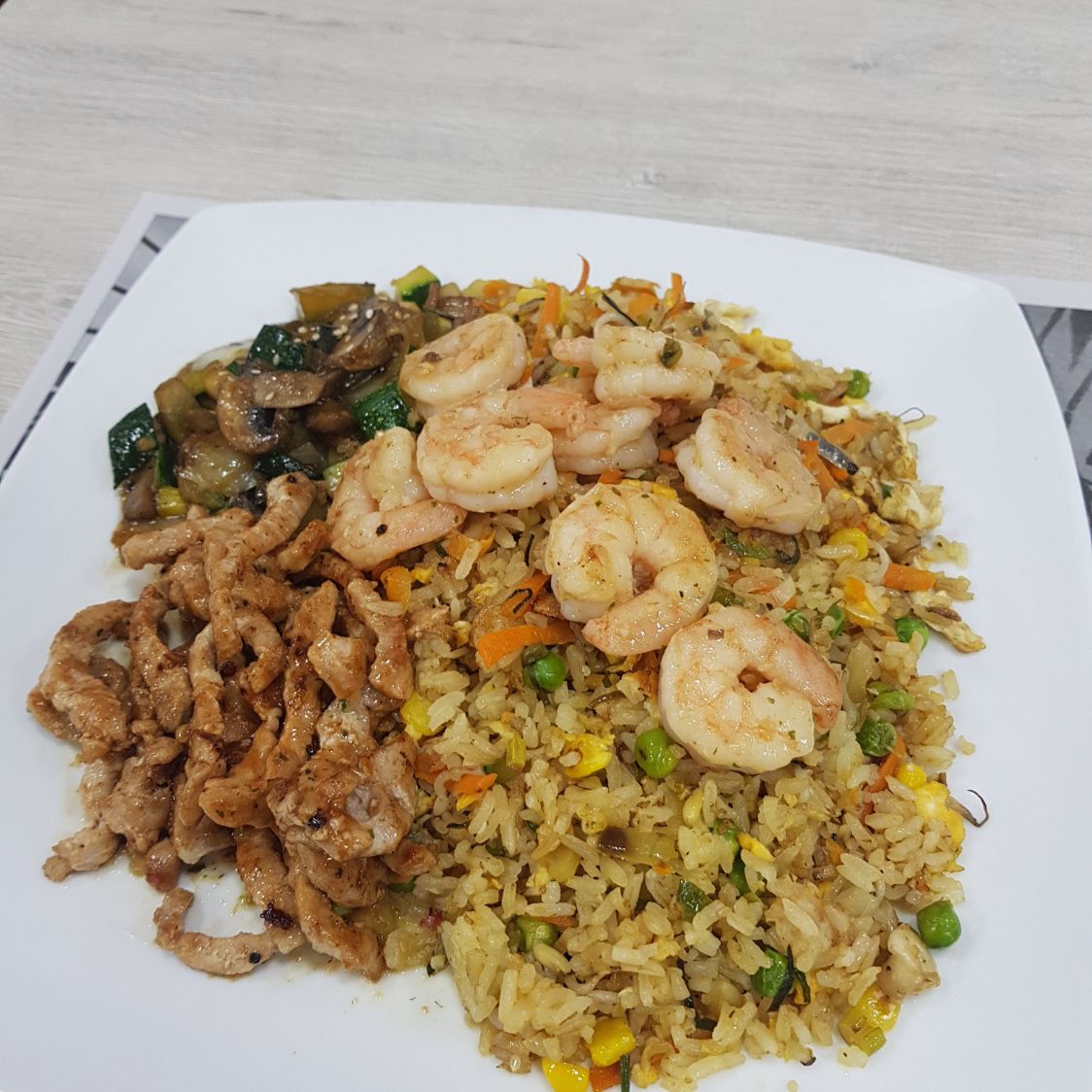 Camarón y cerdo, acompañados de arroz frito y vegetales teriyaki.