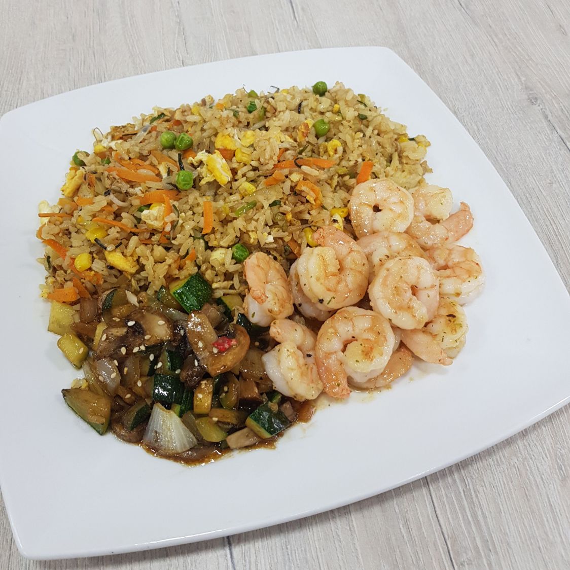 Camarones al ajillo, acompañados de arroz frito y vegetales teriyaki.