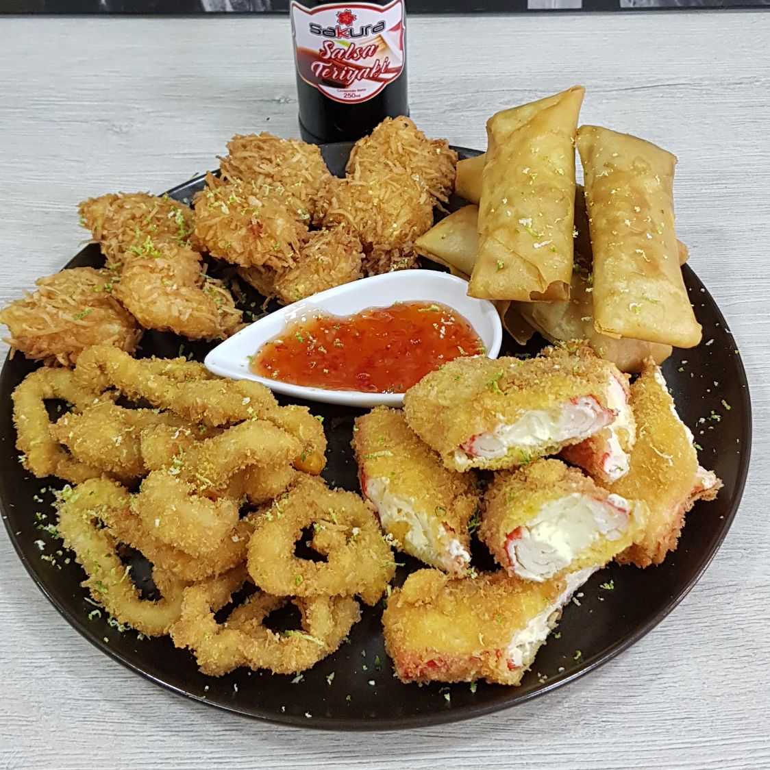 Anillos de calamar, camarón cripsy, spring rolls, palmitos crispy.
