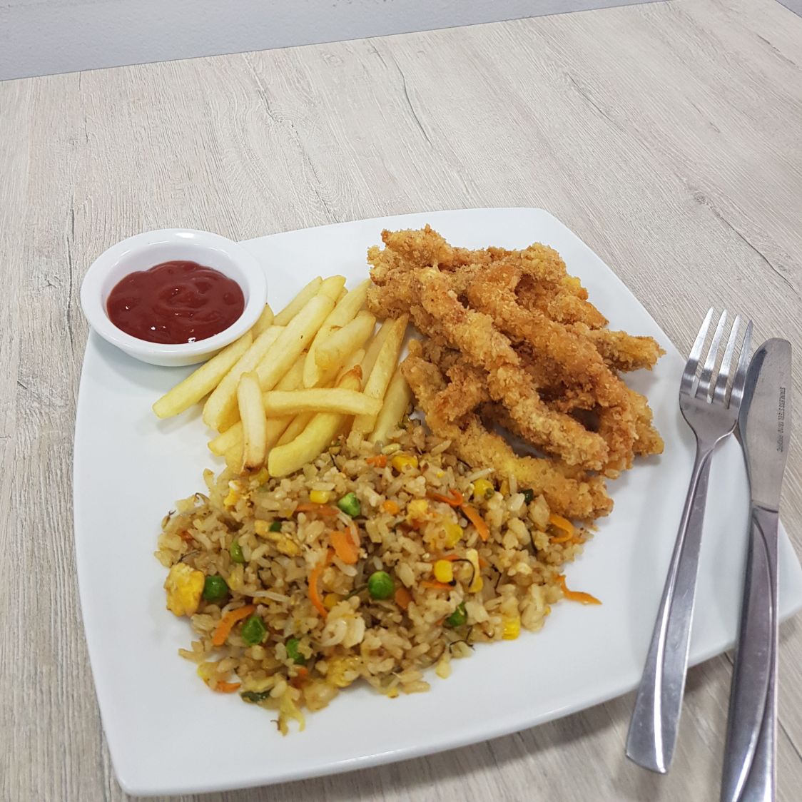 Trozos de pollo apanados, papas a la francesa, acompañados de arroz frito.