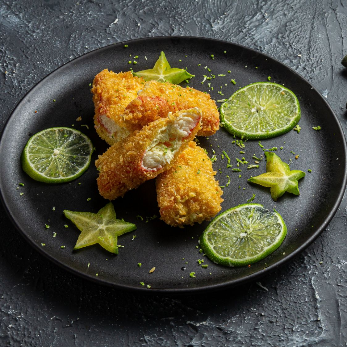 pescado blanco en tempura, plátano maduro y queso crema, crocante por fuera.