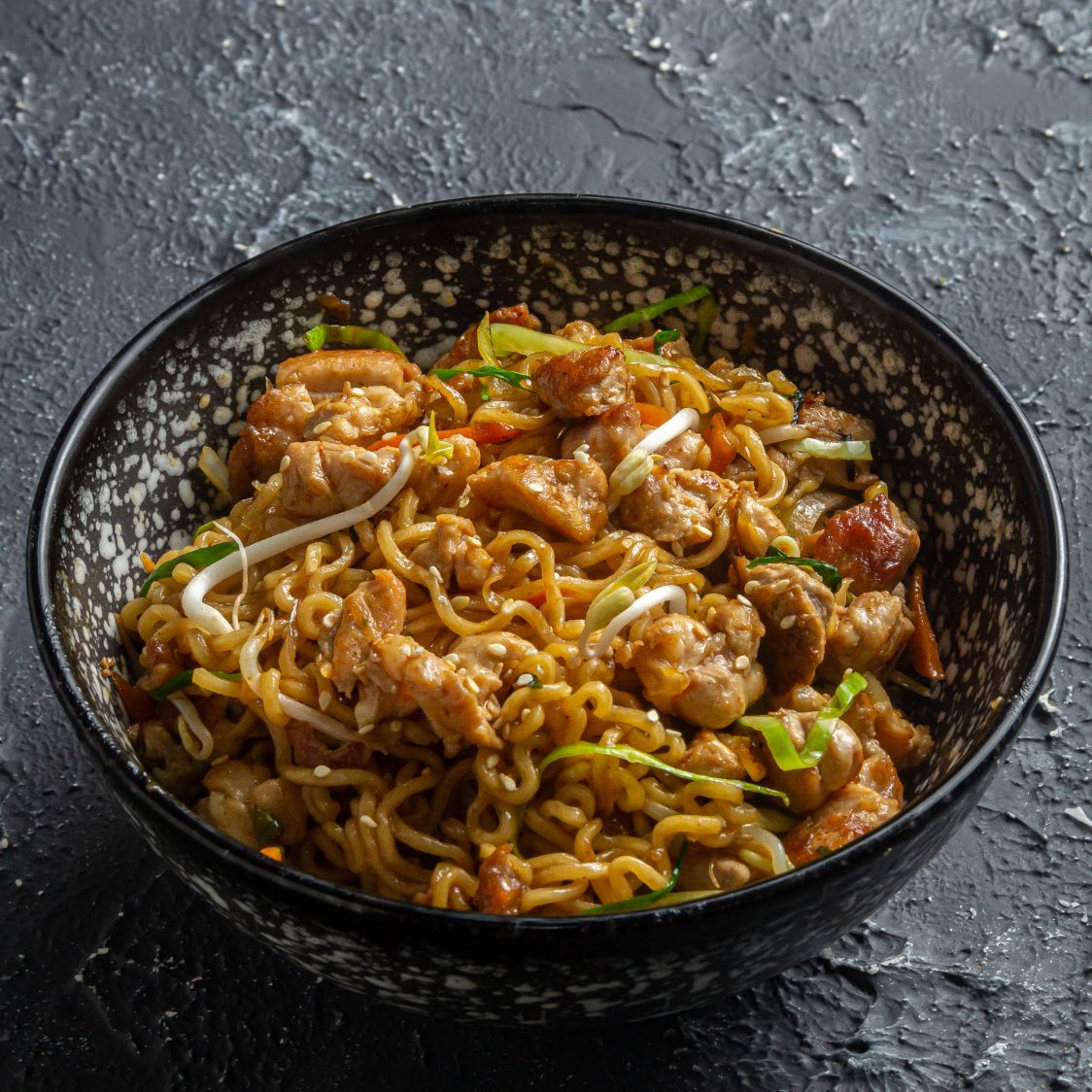 Fideos tipo ramen, lomo de cerdo, pollo y vegetales, salteados en salsa tonkatsu.