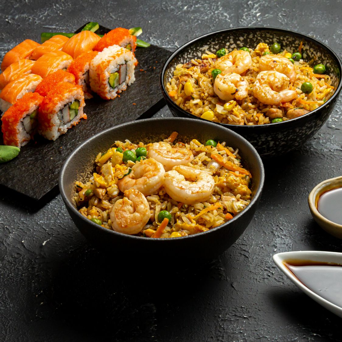 Dos Arroces Frito Con Pollo Teriyaki y Camarones Al Ajillo Mas 12 Bocados De Sushi a Eleccion