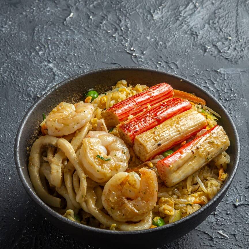 Langostino, camarón y calamar, mezclado con tocineta y arroz frito.