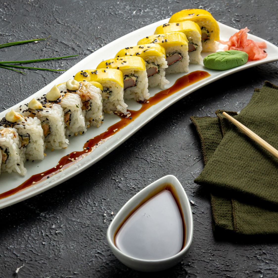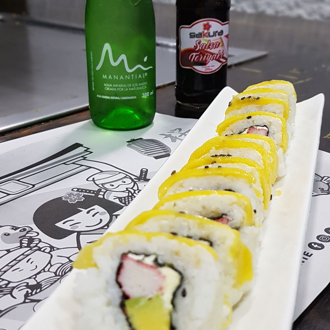 3 rollos de sushi diferentes, de 12 piezas cada uno (36 piezas en total). Elige tres sabores y dos salsasa elegir para cada rollo, a tu gusto.