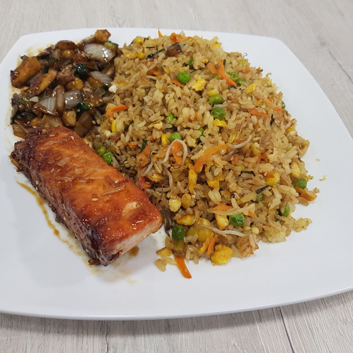 Filete de salmón, acompañado de arroz frito y vegetales teriyaki.