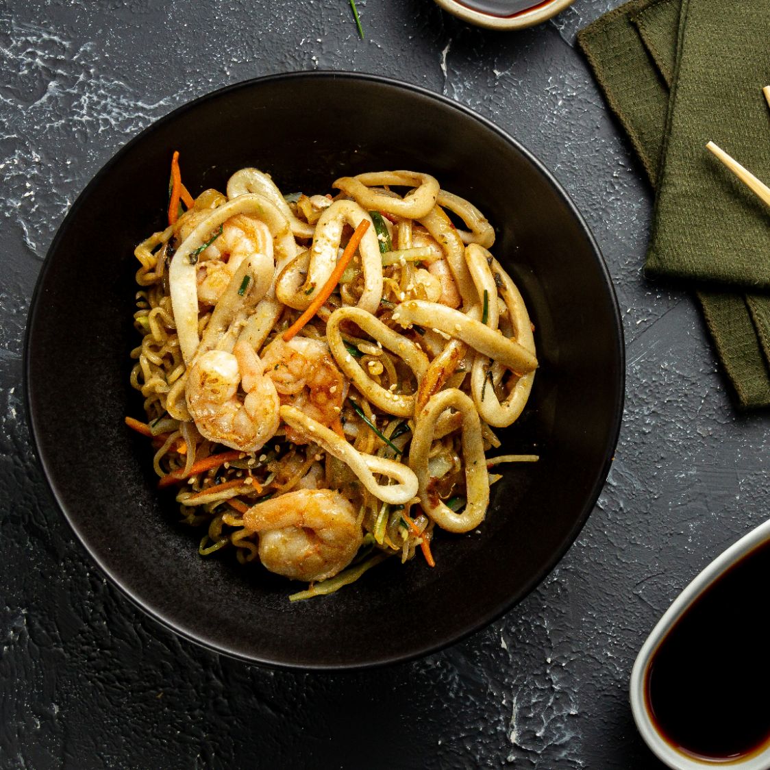 Fideos tipo ramen, camarón, calamar y vegetales, salteados con salsa tonkatsu.