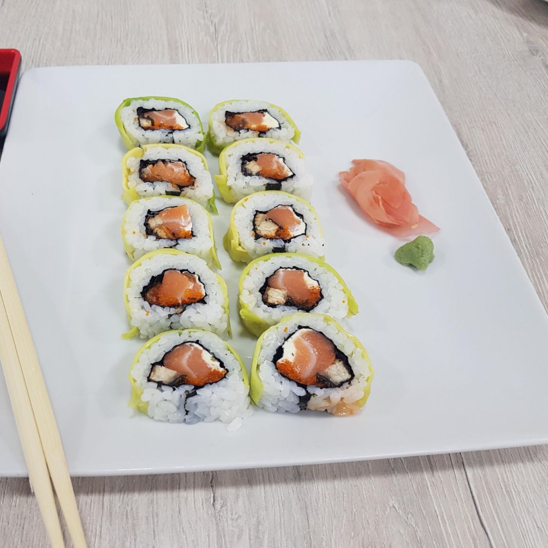 Salmon, masago, queso crema y palmito de cangrejo, envuelto en aguacate.