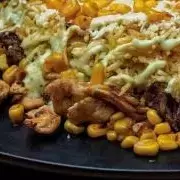 Papas chips, mazorca, carne mechada, pollo desmechado, queso gratinado y 2 huevos de codorniz.