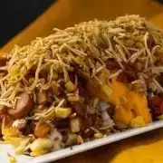 Salchicha, papas chips, queso, pollo, champiñones y salsa de la casa.