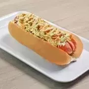 Perro caliente con doble salchicha americana, cebolla, papa chips, doble queso, pollo, champiñones y salsa de la casa.