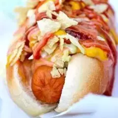 Salchicha americana, cebolla, papas chips, queso y salsas de la casa.