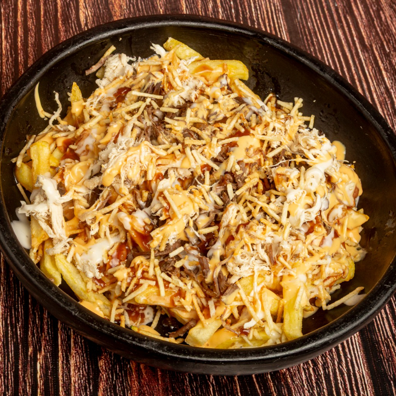 Papas a la francesa, salchicha americana, queso fundido, papas chips, salsas de la casa, carne y pollo mechado en salsa BBQ.